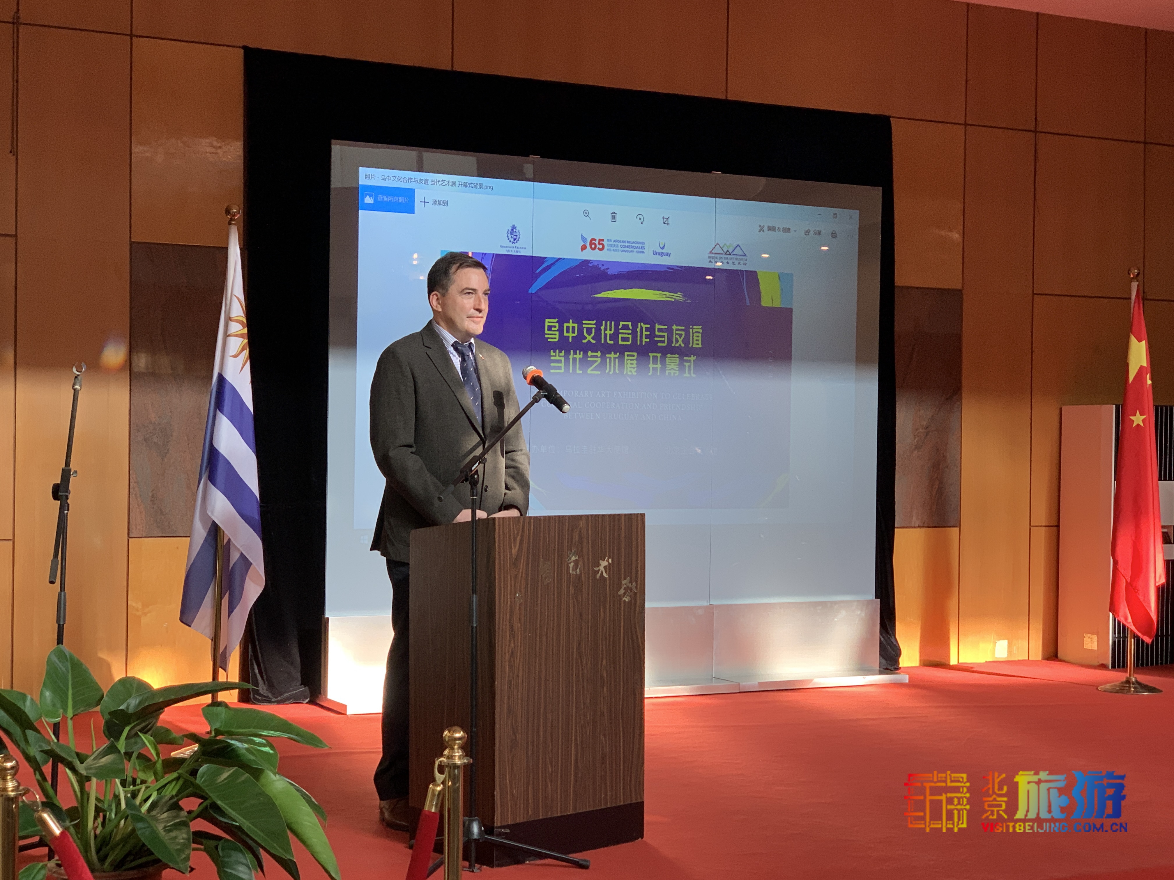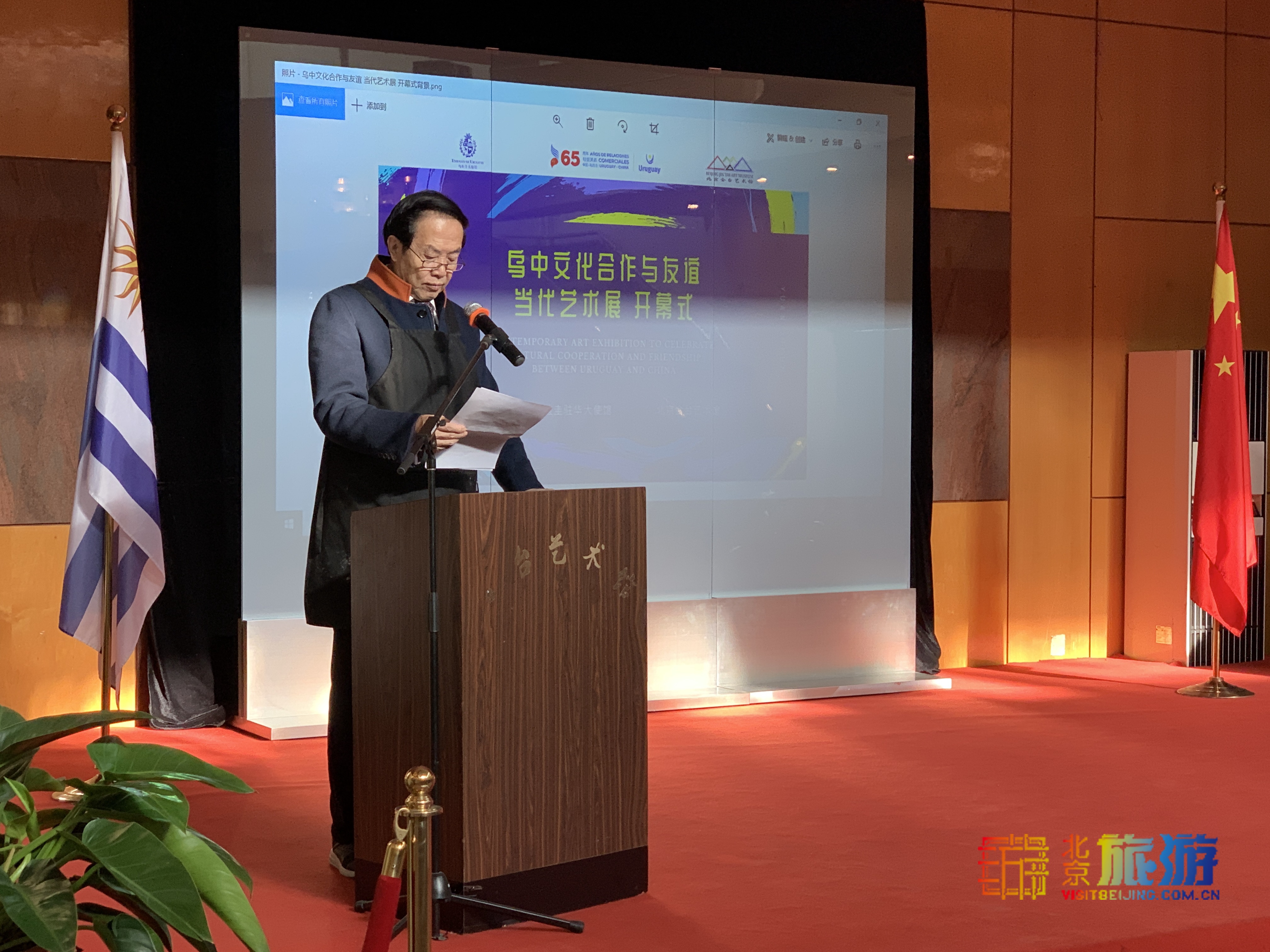 Fernando Lugris, señor embajador de Uruguay en China, Yuan Xikun, director del Museo de Arte Jintai Beijing, y Mauricio Paz Viola, artista contemporáneo de Uruguay, participan en el evento.