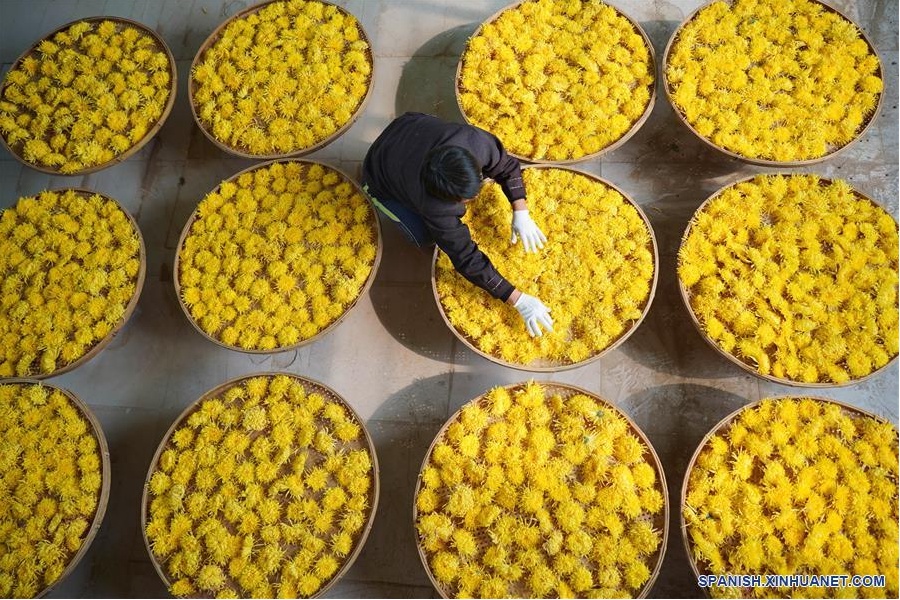 Un trabajador coloca flores de crisantemo en un contenedor para hornearlas en un jardín ecológico agrícola, en la aldea de Wuzhong del distrito de Qiaoxi, Xingtai, en la provincia de Hebei, en el norte de China, el 17 de noviembre de 2019. El desarrollo de la industria de plantación de crisantemo en el distrito de Qiaoxi, Xingtai, ha servido como una forma de mejorar el ingreso de los residentes. (Xinhua/Zhu Xudong)