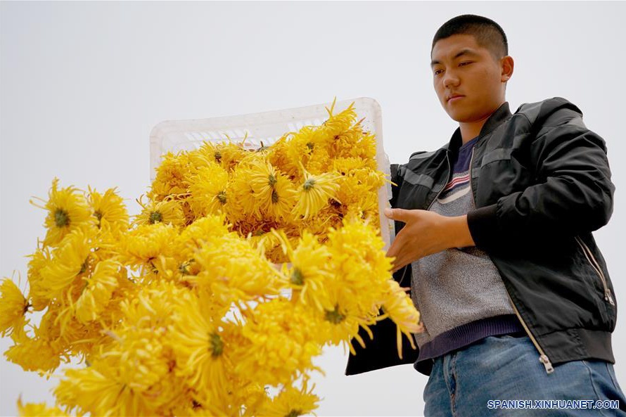 Un trabajador recolecta flores de crisantemo recién cosechadas en un jardín ecológico agrícola, en la aldea de Wuzhong del distrito de Qiaoxi, Xingtai, en la provincia de Hebei, en el norte de China, el 17 de noviembre de 2019. El desarrollo de la industria de plantación de crisantemo en el distrito de Qiaoxi, Xingtai, ha servido como una forma de mejorar el ingreso de los residentes. (Xinhua/Zhu Xudong)