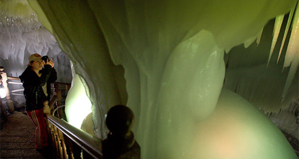 Las escaleras de madera en la cueva se limpian dos veces al día para evitar la acumulación de hielo.