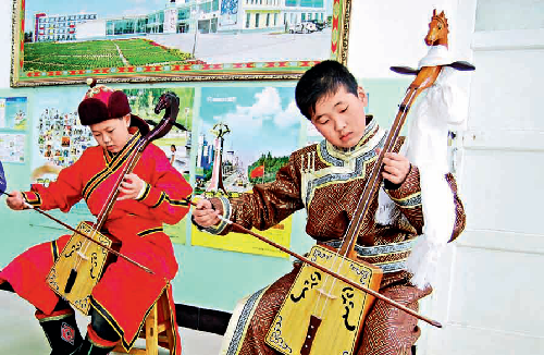 Por su parte, los instrumentos de cuerda con arco son usados ampliamente en diversos tipos de ejecución (en solos, con más de dos músicos, en conjuntos musicales o en acompañamientos). Los instrumentos más representativos son el erhu (violín de dos cuerdas), el banhu (violín de dos cuerdas con resonador de coco y caja de madera, que se utiliza principalmente en el norte de China), el gehu (violonchelo de cuatro cuerdas), el matouqin (violín de dos cuerdas con cabeza en forma de caballo), el jinghu (violín de dos cuerdas, especialmente usado en la Ópera de Beijing), el zhonghu (violín de dos cuerdas con un tono más bajo que el erhu), el gaohu (violín de dos cuerdas con un tono más alto que el erhu).