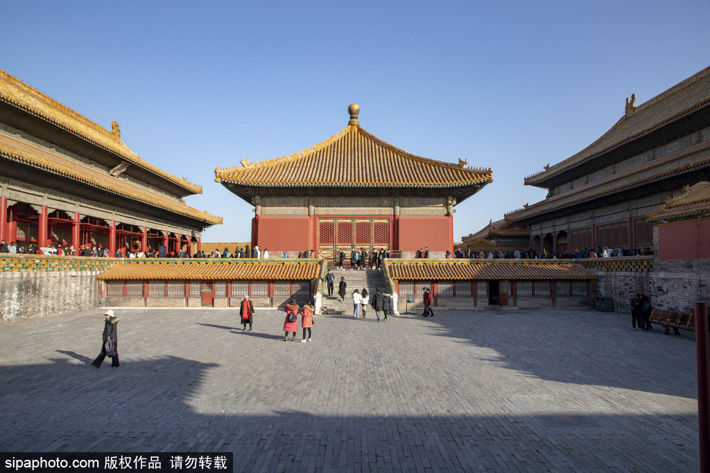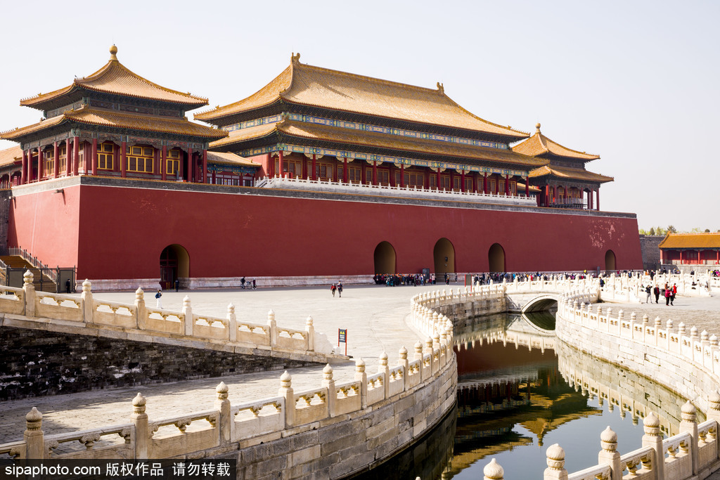 Los edificios principales de la Ciudad Prohibida a lo largo del eje central de Beijing de sur a norte son respectivamente Puerta Meridional, Salón de la Suprema Armonía, Salón de la Armonía Central, Salón de la Preservación de la Armonía, Palacio de la Pureza Celestial, Salón de la Unión, Palacio de la Tranquilidad Terrenal, Puerta de la Divina Destreza.