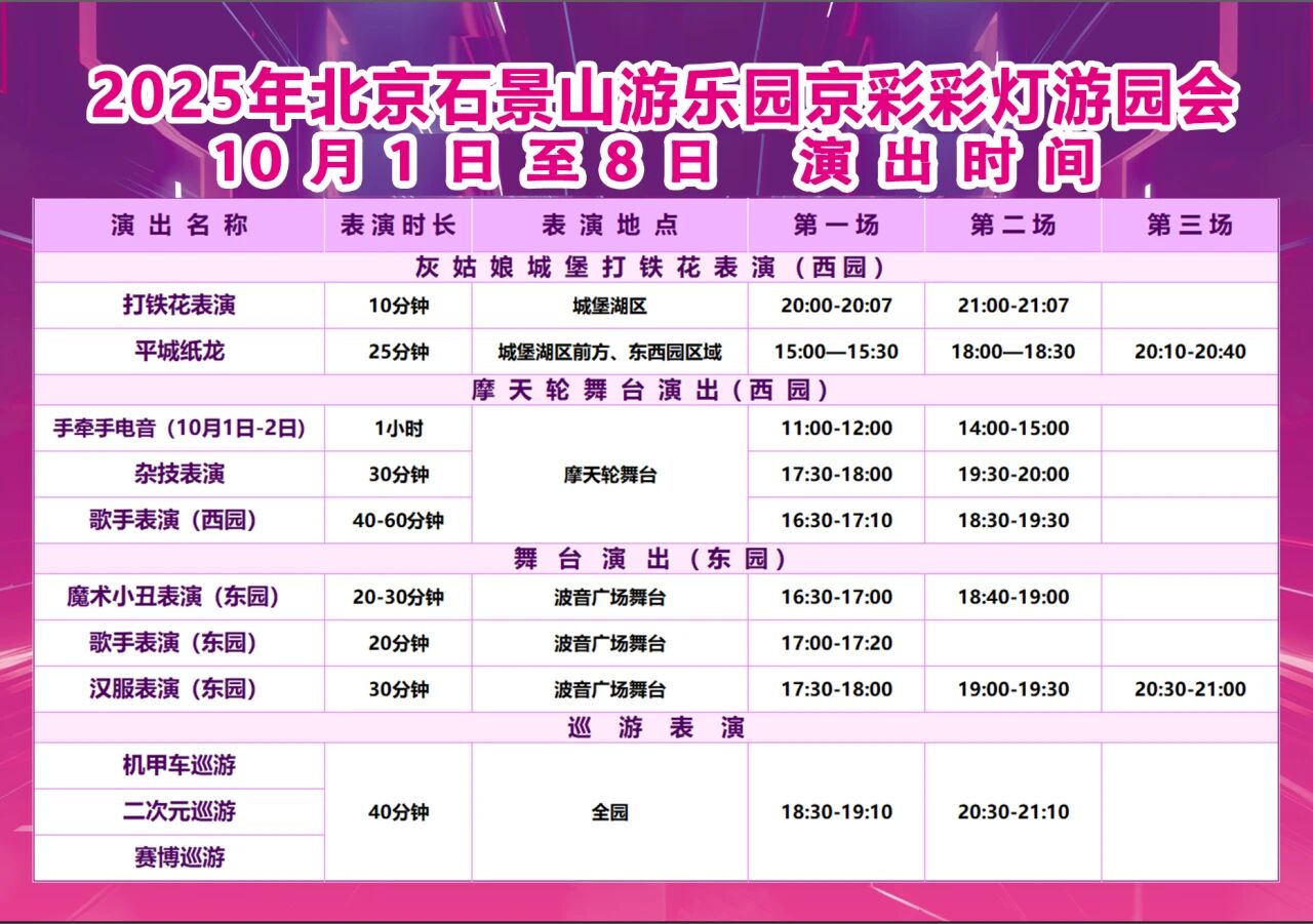 En la Plaza Boyin del Parque Este y la Noria del Parque Oeste del Parque de Atracciones de Shijingshan, se alternarán actuaciones de diversos géneros musicales. Las danzas con vestidos de Hanfu se desplegarán bajo las luces del escenario, creando al instante una atmósfera tradicional china. Las actuaciones acrobáticas serán emocionantes, mientras que las de los payasos serán alegres y divertidas.