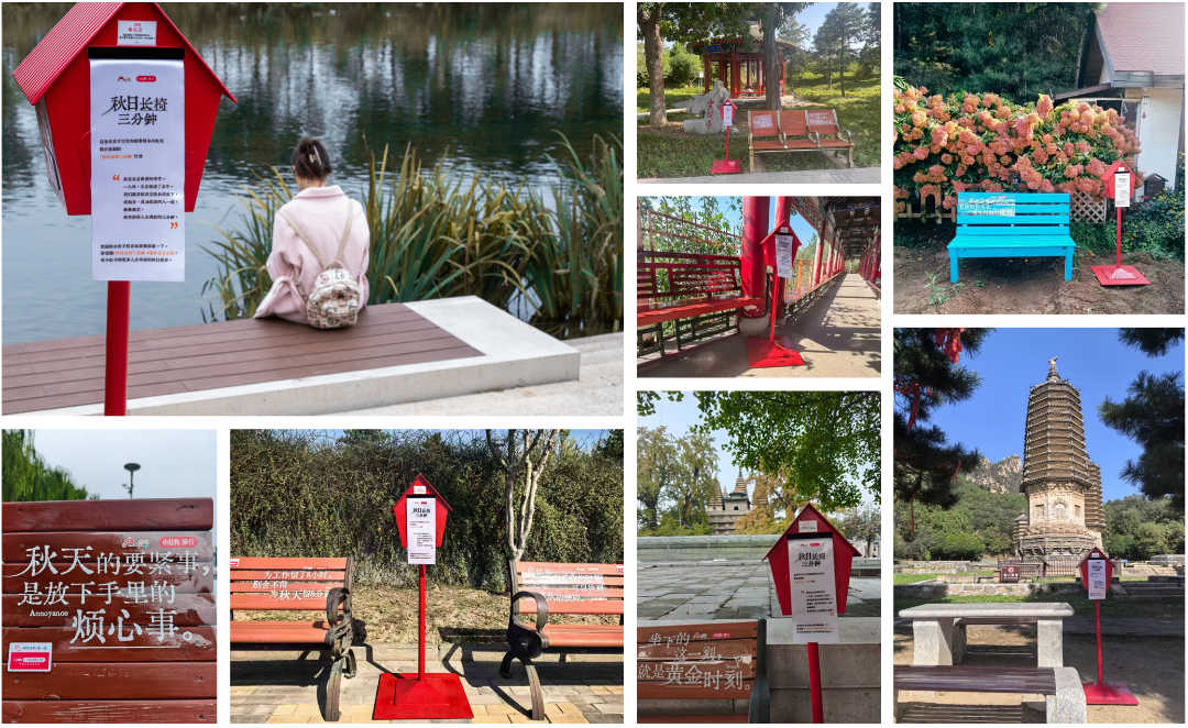 Además de las escenas de "fotogramas de película", el evento también cuenta con 60 buzones con temática otoñal y más de 200 bancos distintivos por toda la ciudad, incluyendo el Templo del Cielo, el Parque Badachu, el Templo Tanzhe, la Montaña Miaofeng, la Gran Muralla de Mutianyu, etc. Los visitantes pueden descansar y relajarse en los bancos, tomarse fotos con ellos y usar la función de "un toque" de los buzones para compartir hashtags como #秋日长椅三分钟# (#TresMinutosenlosBancosdeOtoño) #漫步北京之秋# (#UnPaseoporBeijingenOtoño) #秋日散步美学# (#EstéticadePaseoenOtoño) en Xiaohongshu y participar en actividades interactivas, descubriendo los recursos culturales, comerciales, turísticos y deportivos en los alrededores, y experimentando el ambiente artístico y la vitalidad del consumo de la "vida lenta" otoñal de Beijing.