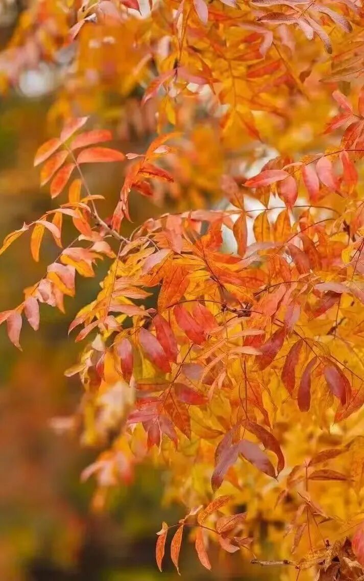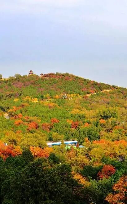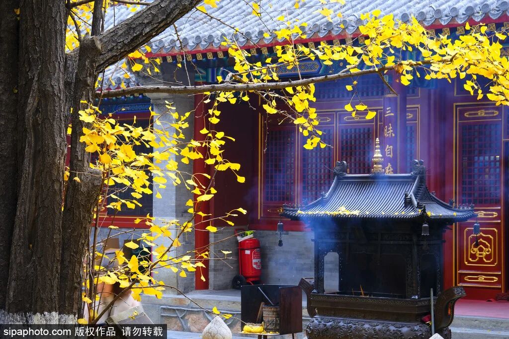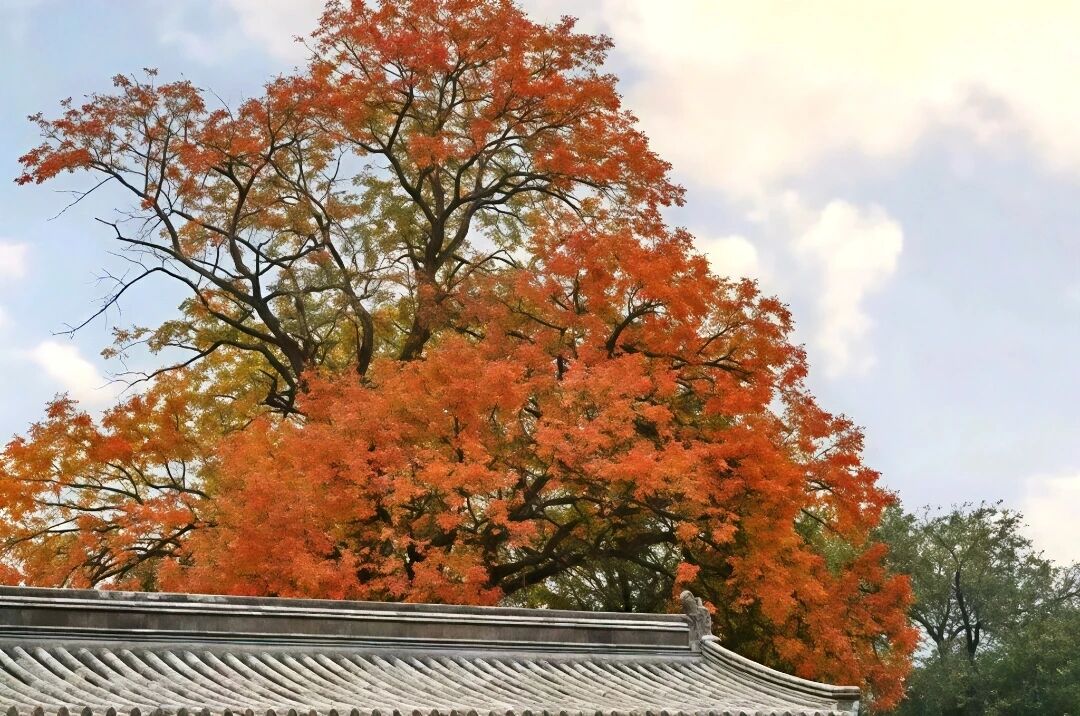 Desde mediados de octubre hasta mediados de noviembre, las hojas de árboles como el Cotinus, el zumaque y el arce cambian de verde a rojo, extendiéndose desde la falda de la montaña hasta la cima. Entremezcladas con pinos y cipreses verdes, y ocasionalmente con las brillantes hojas amarillas del ginkgo, creando uno los "Doce Paisajes de las Tres Montañas y los Ocho Templos": las "Hojas Rojas en Otoño Avanzado".