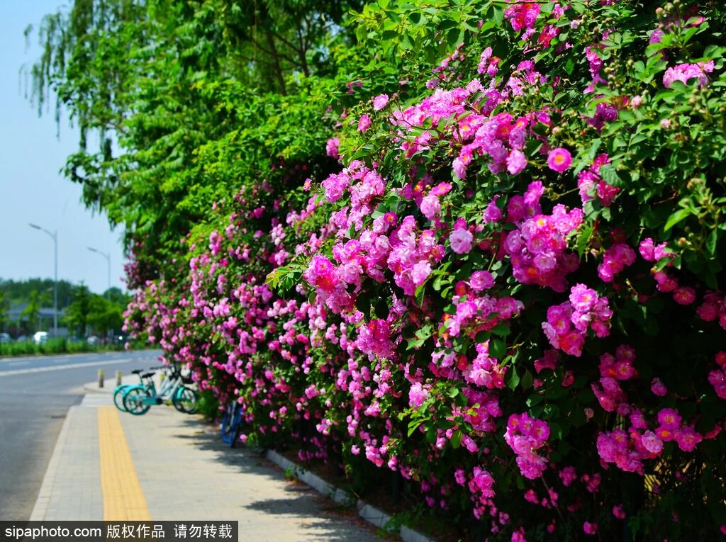 En mayo, Beijing se llena de los sutiles indicios del comienzo del verano. Las rosas multifloras florecen silenciosamente a lo largo de muros, barandillas y calles, sus pétalos caen como cascadas, y sus frescos colores crean un paisaje tranquilo y elegante en toda la ciudad. En el Parque Forestal Olímpico, largas paredes de flores crecen a lo largo de las barandillas, acompañadas de una profusión de flores. Paseando por Beiluoguxiang, el encanto antiguo de sus ladrillos y tejas grises es palpable, y en cada esquina se encuentran muros cubiertos de rosas multifloras. Las flores rojas, amarillas y moradas, sobre un fondo de vegetación, son exquisitamente bellas, añadiendo un encanto único de principios de verano a la calle antigua.