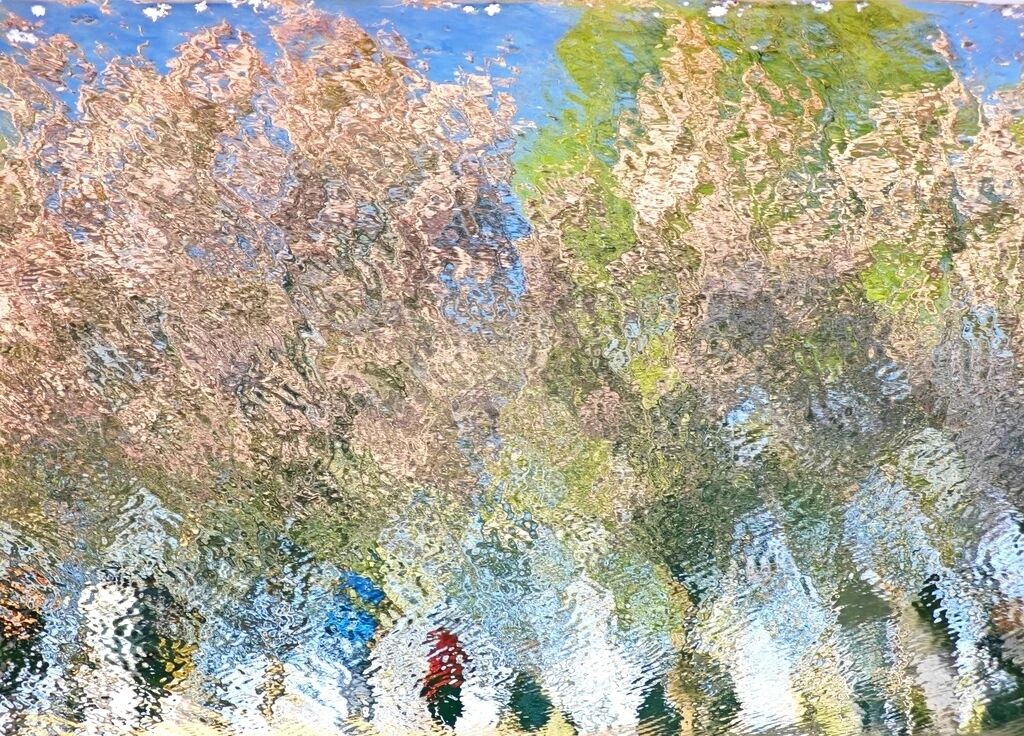 Las delicadas flores rosadas, resplandecientes con un halo de luz, se mecen con la brisa, y sus reflejos brillan sobre la superficie del río como una pintura al óleo.